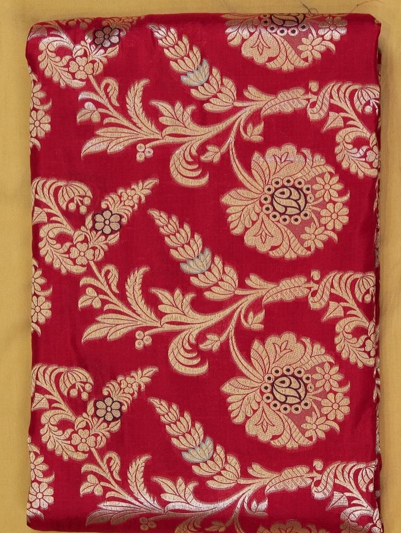 Rich red Banarasi silk saree with intricate floral work for weddings and festivals.